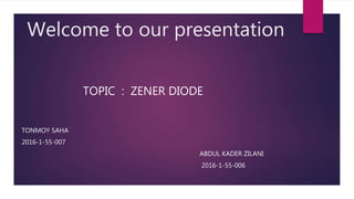 This presentation introduces Zener diodes. It discusses that a Zener diode is a silicon pn junction designed to operate in reverse breakdown, maintaining a constant voltage even as current changes. The document examines Zener breakdown characteristics, showing how reverse current increases rapidly at the knee point where breakdown begins. It provides an example calculation of Zener impedance. Applications of Zener diodes discussed include waveform clipping, voltage regulation, and voltage shifting.