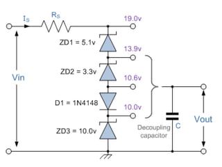 The Zener diode can regulate voltage by maintaining a constant reverse breakdown voltage. It does this by operating in reverse bias mode, where it exhibits a nearly constant voltage over a range of reverse currents. This makes it useful for voltage regulation, where connecting a Zener diode across an output can stabilize the voltage despite variations in input voltage or load current.