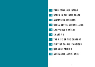 Artificial intelligence is powering new trends in 2017 that will impact the consumer journey. These trends include predictive search capabilities that anticipate consumer needs, the ability to identify and react quickly to new trends from vast amounts of online data, and the passive collection of behavioral data from internet-connected devices to deliver personalized experiences. Brands can take advantage of these trends to enhance the consumer experience at each stage of the journey and stay ahead of competitors.