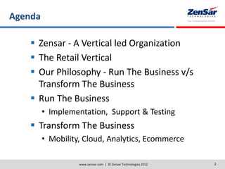 This document summarizes Zensar's retail solutions for both running existing retail business processes as well as transforming businesses through new technologies. It outlines Zensar's vertical specialization in retail, capabilities in Oracle Retail and other solutions, and services to support standard retail processes like supply chain management and financial planning. It also describes Zensar's solutions for transforming retail through mobility, cloud, analytics, e-commerce and technologies like predictive planning. The document is intended to show how Zensar can help retailers both run their existing business as well as transform it through new technologies.