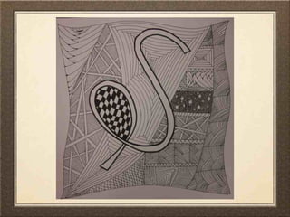 #15 After you draw your initial on your final paper, you will use pencil to break up the space around your letter.Some of the space will be naturally broken by your letter, but you will need to decide how else you want it to be broken up. Outline your initial with Sharpie marker and begin using your thumbnail patterns to fill in the spaces that you created with ink.