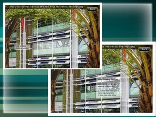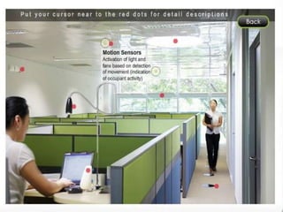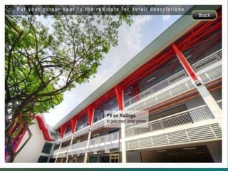 The document summarizes a Zero Energy Building (ZEB) in Singapore that was retrofitted from an existing building. The ZEB produces enough renewable energy, through solar panels and other green technologies, to power its own operations and reduce its energy costs to zero. It serves as a test bed for green building technologies and aims to educate practitioners and students on energy efficiency and sustainability. Some features of the ZEB mentioned include natural ventilation, daylighting systems, electrochromic glass, solar panels, and vertical greenery walls.