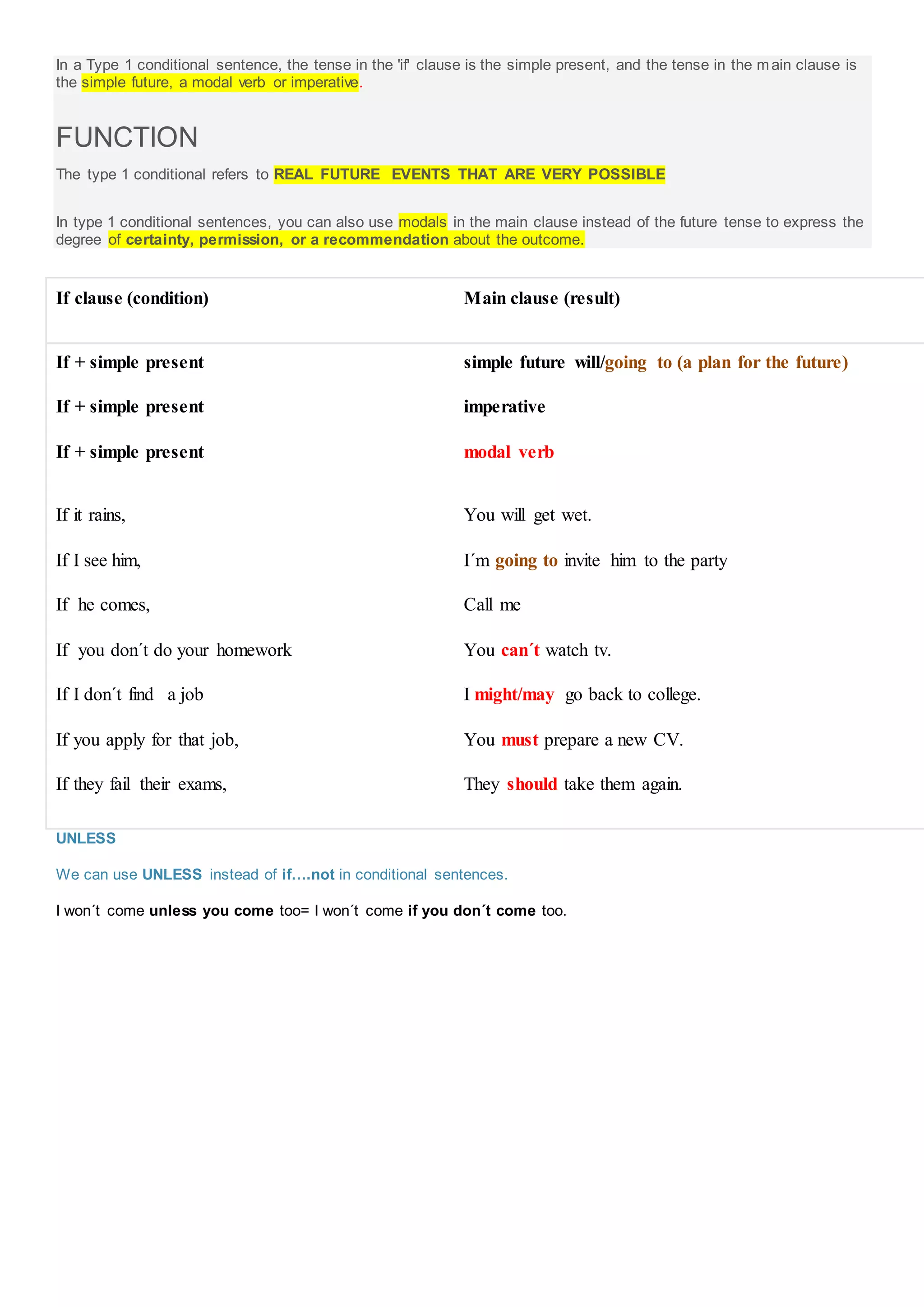 Zero conditionals express general truths using the simple present tense in both clauses, such as "If you heat ice, it melts." Type 1 conditionals refer to possible future events, using the simple present in the if-clause and simple future, modal verbs, or imperatives in the main clause, like "If it rains, you will get wet." Both conditionals express cause-and-effect relationships between the if-clause and main clause.