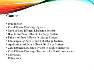 The document discusses zero effluent discharge systems. It provides an introduction and overview of zero effluent discharge, including the need for such systems, their benefits, drivers and challenges. It then discusses specific applications for zero effluent discharge in industries like textiles. The document focuses on zero effluent discharge treatment of textile wastewater, outlining the key treatment steps and environmental challenges.