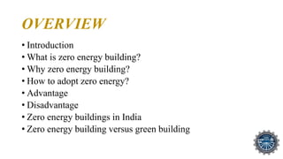Zero Energy Buildings (ZEBs) are designed to have zero net energy consumption, balancing energy use with on-site renewable energy generation, thus minimizing greenhouse gas emissions. Key approaches to achieving ZEBs include site selection, passive solar design, and the adoption of renewable energy sources like solar and wind. Examples of ZEBs in India highlight their potential benefits, including reduced energy costs and environmental impact, though initial construction costs and expertise can be challenging.