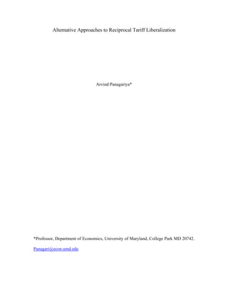This document discusses alternative approaches to reciprocal tariff liberalization in international trade negotiations. It describes how negotiations under the WTO allow flexibility in reducing tariffs on a product-by-product or general formula basis. Sectoral approaches are also discussed, including negotiating access to certain sectors or negotiating bilateral access across sectors. While sectoral approaches can efficiently reduce high tariffs, they may favor developed countries' export sectors and result in an initially lower level of welfare.