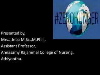 This document discusses hunger and strategies to achieve zero hunger by 2030. It defines hunger and provides statistics on the number of hungry people worldwide. The main causes of hunger are identified as poverty, natural disasters, political instability, and food shortages. The UN's Zero Hunger Challenge aims to end hunger by making food systems sustainable, ending rural poverty and malnutrition, eliminating food waste, and ensuring access to nutritious foods for all. Some strategies proposed to achieve this include creating jobs, investing in agriculture, educating women, promoting gender equality, using modern farming techniques, providing food assistance, supporting small farmers, developing drought-resistant crops, practicing sustainable agriculture, and providing agricultural subsidies. Coordinated efforts by governments, citizens,