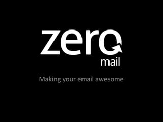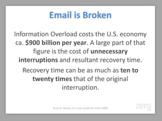 The document summarizes ZeroMail, a proposed web-based email solution designed to improve productivity and reduce information overload. It uses artificial intelligence in the form of a virtual assistant to filter and sort emails based on 100,000 filters and the user's circle of trust. The assistant's decisions are peer-reviewed. It offers different views and overload tools. The business model involves a subscription of $20-80 per month based on email volume. Funding is being sought to accelerate adoption, test customer acquisition channels, expand the assistant pool, develop mobile clients, and improve support.