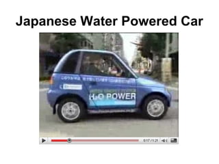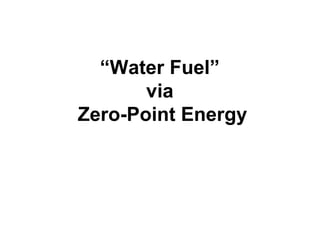This document discusses using zero-point energy to power "water fuel" vehicles. It explains that pulsing electrolyzers can create charged water gas clusters that may couple to zero-point energy in a similar way as plasma through cavity quantum electrodynamics. The goal is to develop closed-loop self-running systems that produce gas from water alone using this energy source to minimize external power needs.