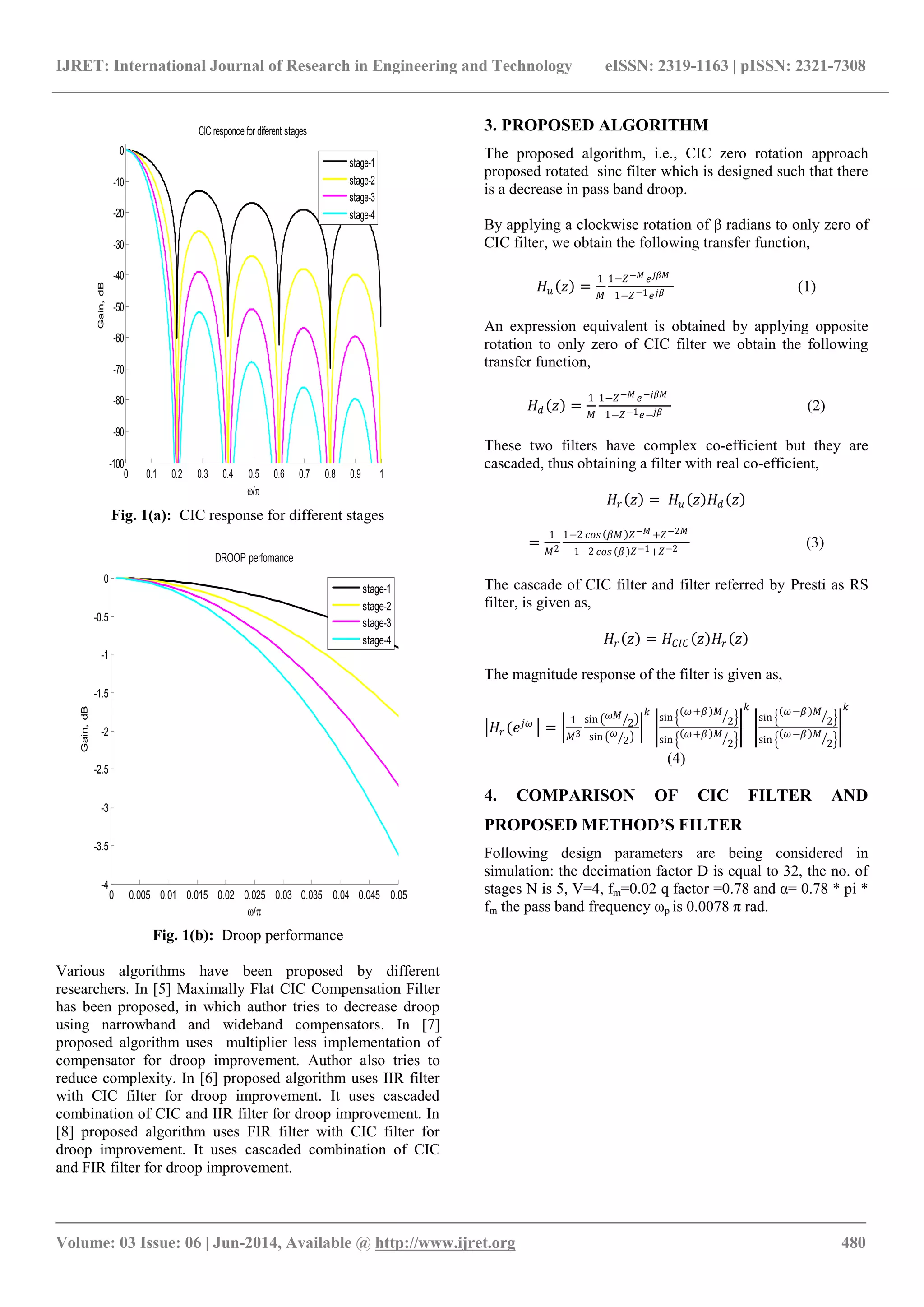 This document discusses improving the pass band droop in cascaded integrator comb (CIC) filters. CIC filters are commonly used for decimation but exhibit high pass band droop. The document proposes a zero rotation approach to improve droop. It compares the magnitude response of the original CIC filter to the proposed filter with zero rotation. The proposed filter shows over 1dB improvement in droop at the pass band frequency. The distribution of zeros is also improved in the proposed approach.