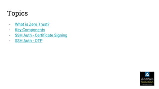 The document explains zero trust architecture, which emphasizes the need for verification of all actors, systems, and services before granting access, moving away from the assumption of inherent trust. It details the key components required to achieve zero trust, including a centralized authentication system using Keycloak for identity management and HashiCorp Vault for secure secrets management, along with their key features for enhancing security. The document also outlines the integration process for these systems to enable secure access to servers and services.
