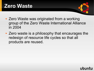 Zero Waste is a philosophy originated in 2004 by the Zero Waste International Alliance to redesign resource life cycles so that all products are reused. It aims to guide lifestyles and practices to emulate sustainable natural cycles in an ethical, economical, and visionary way. Examples of zero waste include vehicles with ecological responsibility, green construction projects, reusable glass milk bottles, and biodegradable plastics. The document expresses the opinion that zero waste is very efficient and ecological, and can make the world better.