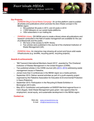 Zero Waste MENA is a regional initiative aimed at eliminating waste in the Middle East and North Africa through various objectives: promoting waste avoidance, minimization, reuse and recycling; raising awareness through educational campaigns; and incentivizing communities to advocate for zero waste plans. The organization works with governments, private sectors and NGOs on research, professional development, technical assistance and public awareness projects to achieve its goals. It partners with other waste management organizations and its projects include an online blog and social media campaign, a library of waste research, and an interactive waste infrastructure map.