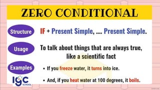 Zero conditional sentences are used to describe general truths or facts that are always true. They contain an "if" clause and a main clause both in the present simple tense, such as "If you heat ice, it melts." Zero conditional sentences can also replace "if" with "when." Examples of zero conditional sentences include "If you heat water to 100 degrees, it boils" and "When it's cold, I always wear a jacket." A review quiz tests the formation of zero conditional sentences.