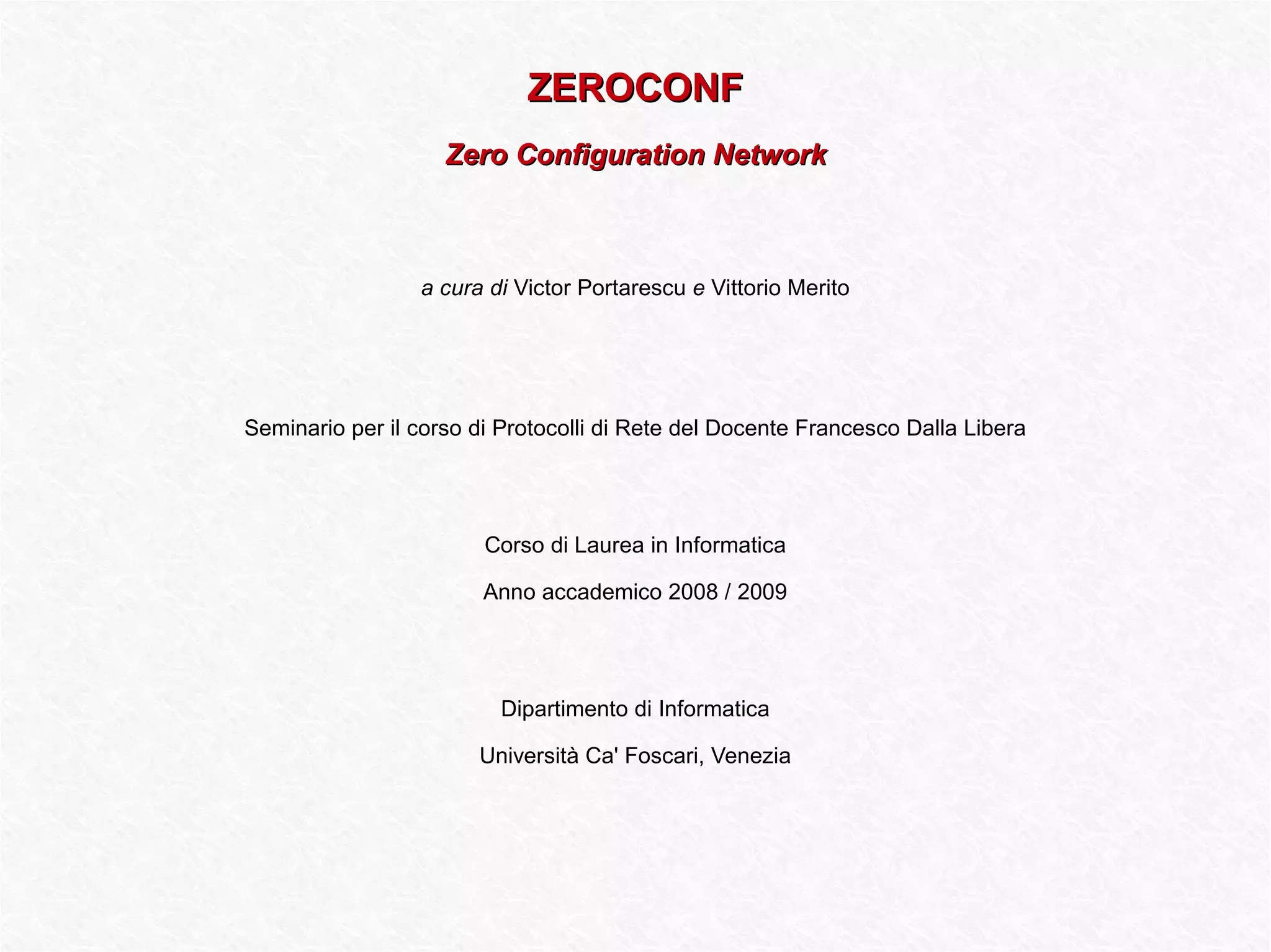 Il documento fornisce un'introduzione al protocollo Zeroconf, che consente la configurazione automatica delle reti senza intervento dell'utente, vantaggioso per piccole reti. Viene esaminata la panoramica dei servizi offerti, tra cui configurazione degli indirizzi IP e scoperta dei servizi, oltre a discutere implementazioni significative come Bonjour di Apple. Infine, si concluderà evidenziando la mancanza di uno standard ufficiale e i rischi associati all'uso di Zeroconf in reti di grandi dimensioni.