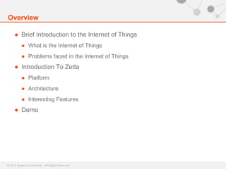 The document discusses an IoT workshop presentation about Zetta, an open source API-first platform for building IoT applications. Zetta addresses common issues with IoT like different protocols, security, and managing large numbers of devices. It uses HTTP to communicate between devices and generates APIs from Node.js code. Zetta also makes it easy to coordinate devices globally, broadcast data via websockets, and develop tools for IoT applications. The architecture involves lightweight Zetta processes running on edge network devices and servers that communicate securely to manage devices and proxy HTTP requests.
