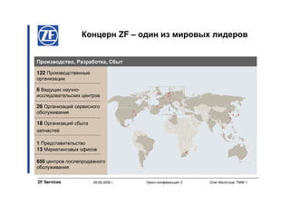 Пресс-конференция ZF Services, состоявшаяся 28 августа 2008 года, представила новые бизнес-направления и сервисные концепции компании, основанные на объединении существующих подразделений. ZF Services предлагает разнообразные сервисные решения для легковых и грузовых автомобилей, включая поддержку партнеров на различных уровнях. За пять лет ZF Services планирует увеличить количество партнеров с 23 до 5000, предлагая им техническую, маркетинговую и информационную поддержку.