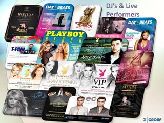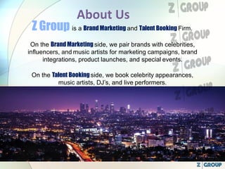 Z Group is a brand marketing and talent booking firm that connects brands with celebrities and influencers for various marketing initiatives. They offer comprehensive services including event production, social media campaigns, and talent appearances, generating significant media impressions for their partnered brands. Notable events include album release parties for artists like Avril Lavigne and Alicia Keys, which featured private performances and extensive media coverage.