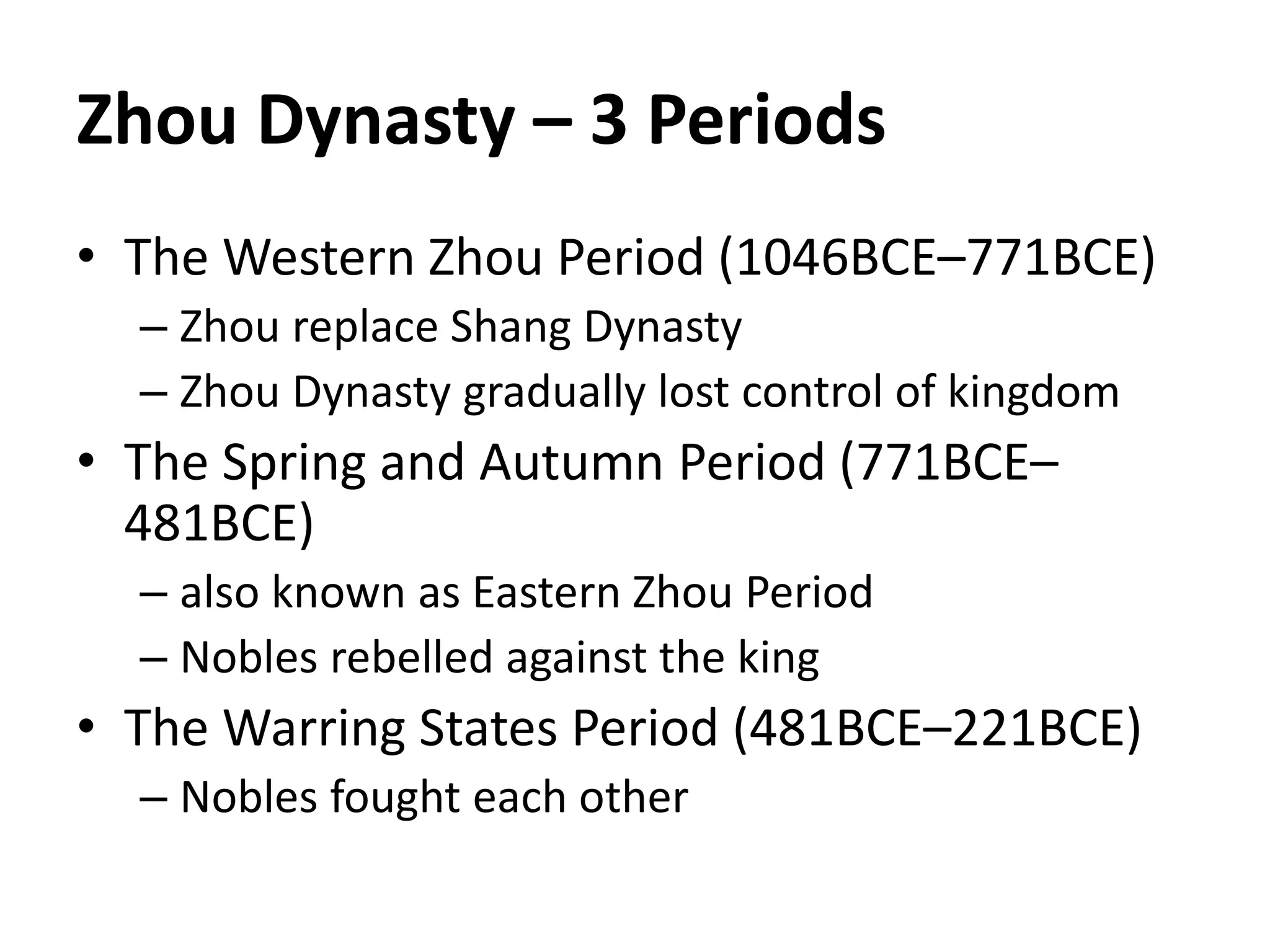The Zhou Dynasty ruled China from 1046 BCE to 221 BCE and was divided into three periods. During the Western Zhou Period the Zhou replaced the Shang Dynasty but gradually lost control of the kingdom. In the Spring and Autumn Period rebel nobles fought against the king. Finally, the Warring States Period saw the nobles warring against each other as nearly 200 states broke off and fought for power.