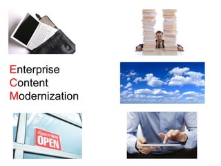 Zia Consulting provides solutions for modernizing agencies and transitioning to digital processes. They help clients go paperless through electronic filing, digital signatures, and intelligent document capture. Zia's solutions include the Ephesoft capture platform, Alfresco for content management, and mobile apps. They also offer cloud hosting and case management software. Zia aims to help agencies save costs, meet requirements, and better serve constituents through modernization.