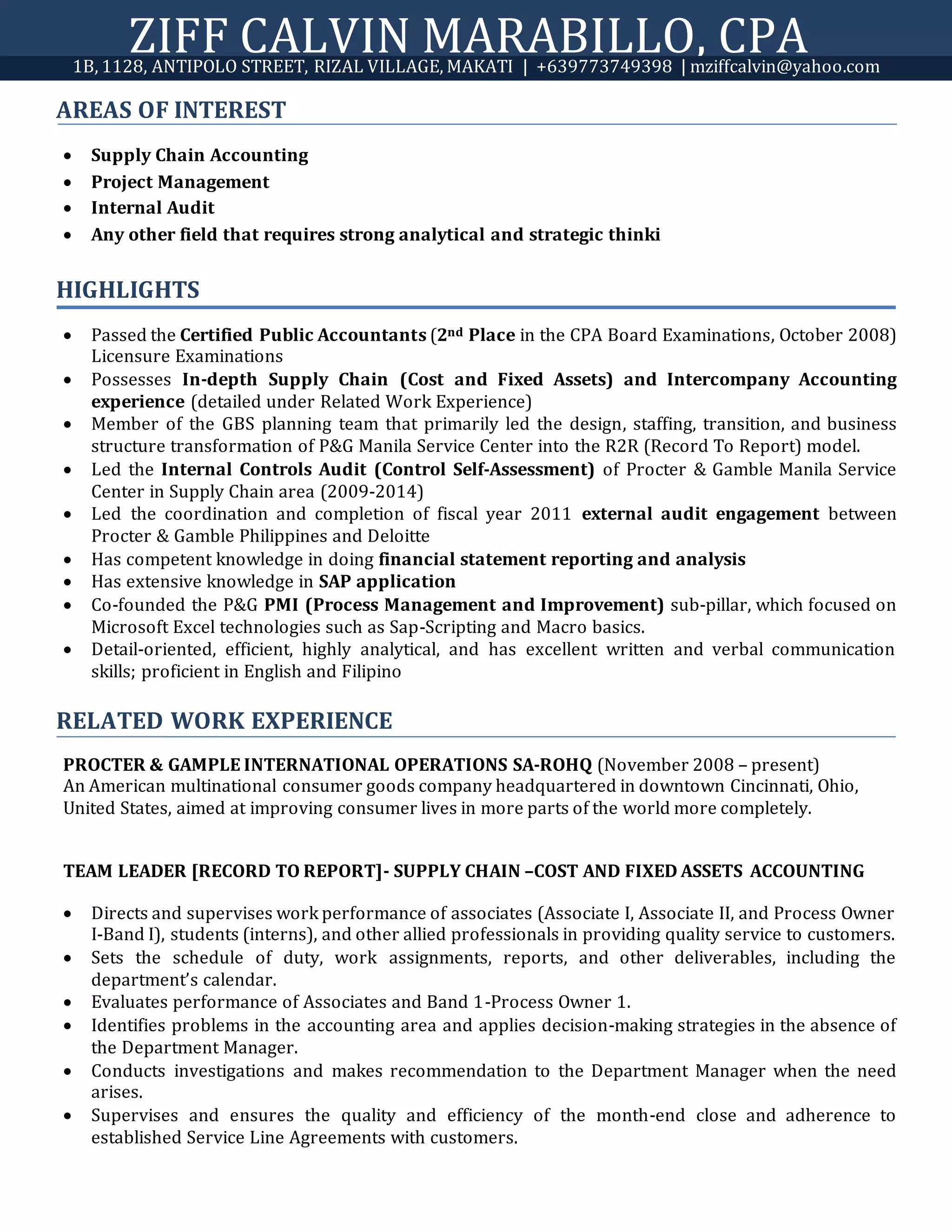 Ziff Calvin Marabillo has over 10 years of experience in accounting, audit, and supply chain roles at Procter & Gamble. He passed the CPA licensure exam in 2008 and has led teams in cost accounting, fixed assets accounting, internal controls audits, and the transformation of P&G's service center. He has received multiple performance and innovation awards for his work. Marabillo holds a Bachelor's degree in Accountancy from Silliman University and is proficient in English and Filipino.