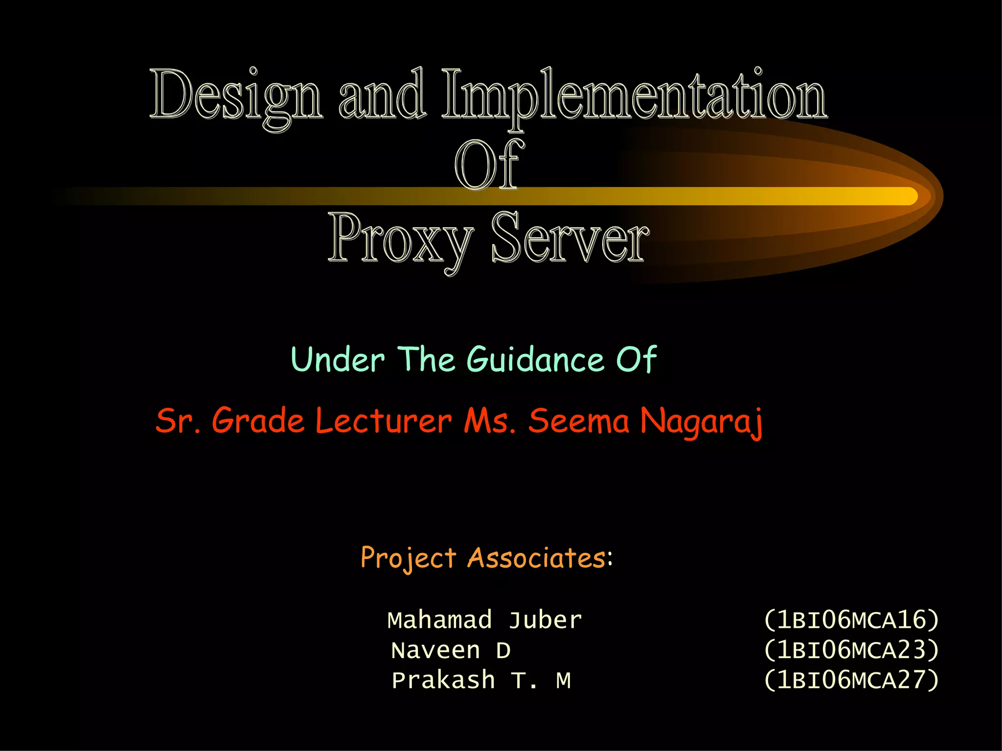 This document discusses the design and implementation of a proxy server. A proxy server acts as an intermediary between clients and external servers, caching frequently accessed content to improve performance and providing firewall functionality to enhance security. The implemented proxy server is a multithreaded Java application that handles client requests, checks the cache for content, forwards requests to remote servers if needed, and returns responses while also updating the cache. It functions by having a main daemon thread listen for connections and spawn new threads to handle each client request by communicating with servers and caching content.