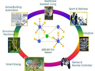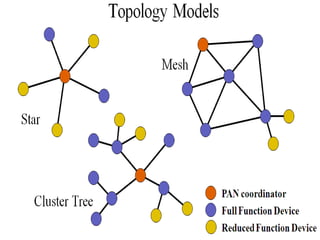 This seminar report provides an overview of ZigBee technology. It defines ZigBee as a wireless networking standard intended for low-power devices. The report outlines ZigBee's key characteristics including low cost, low power consumption, mesh networking topology, and built-in security. It also describes ZigBee's protocol stack and compares it to other wireless technologies like Bluetooth and Wi-Fi. Common applications of ZigBee technology include home automation, wireless sensor networks, and industrial control.