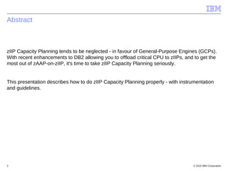 This document discusses zIIP capacity planning for IBM mainframes. It notes that zIIP capacity planning is important given enhancements that allow more workloads to run on zIIPs. It provides guidelines for doing zIIP capacity planning properly through instrumentation and measuring zIIP usage at the address space level. It also discusses factors to consider like LPAR configuration and new software that can exploit zIIPs.