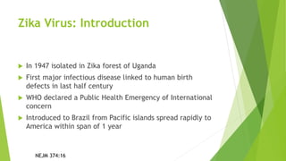 Zika virus was first isolated in 1947 in Uganda. It is transmitted primarily via Aedes mosquitoes and can cause microcephaly and other birth defects. There was an outbreak in Brazil in 2015-2016 which spread rapidly in the Americas. Pregnant women who travel to affected areas are advised to strictly follow steps to prevent mosquito bites. Testing involves RT-PCR of serum and urine within 2 weeks of symptoms, and IgM antibody testing if RT-PCR is negative. Interpretation of results must consider cross-reactivity with other flaviviruses.