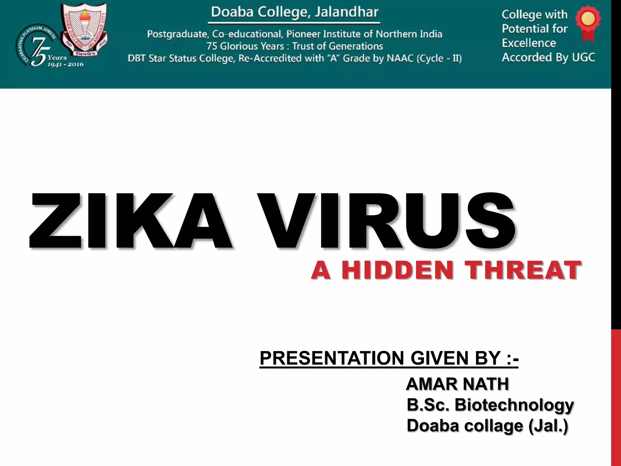 Zika virus was first discovered in Uganda in 1947 and has since spread to many countries. It is transmitted by Aedes mosquitoes and can cause microcephaly in fetuses if the mother is infected during pregnancy. While most Zika infections cause only mild symptoms, it poses a serious threat during pregnancy due to the risk of birth defects. Diagnostic tests for Zika look for viral RNA or IgM antibodies. There is no vaccine or specific treatment, so prevention focuses on controlling mosquito populations and protecting against bites.