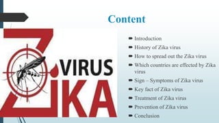 The presentation discusses the Zika virus. It provides an overview of the virus's history, symptoms, transmission, treatment and prevention. The virus is spread primarily via mosquito bites and can cause birth defects if contracted during pregnancy. While symptoms are often mild, it poses neurological risks. Currently, prevention focuses on avoiding mosquito bites and protected sexual contact for those in affected areas. Further research is ongoing to develop a vaccine.