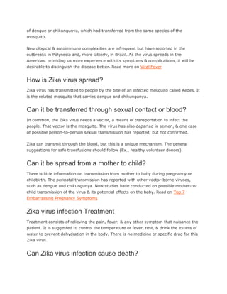 Zika virus, primarily transmitted by Aedes mosquitoes, causes mild symptoms such as fever, rash, and conjunctivitis, lasting from a few days to a week. While severe complications are rare, concerns have arisen from reports linking the virus to birth defects and other neurological issues. Diagnosis typically relies on clinical symptoms and epidemiological context, with no specific treatment available beyond alleviating symptoms.