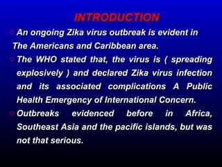 The document summarizes information about the Zika virus outbreak, including that it is spreading explosively in the Americas and Caribbean and has been declared a public health emergency. The virus is transmitted via mosquito bites and sexually and causes mild illness in most cases, but can lead to complications like microcephaly and Guillain-Barre syndrome. Pregnant women infected are at increased risk of fetal complications. While there is no vaccine or treatment, prevention efforts focus on personal protection against mosquitos and safe sexual practices.