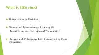 This document provides information about the Zika virus. It discusses that Zika is a mosquito-borne flavivirus transmitted by Aedes mosquitoes. While most cases are asymptomatic, symptomatic cases involve fever, rash, joint pain, and red eyes. There is no vaccine or treatment. The virus can be transmitted from mother to fetus during pregnancy and has been linked to microcephaly in newborns. Testing and guidelines are outlined for pregnant women, infants, and preventing transmission. An administrative order in Puerto Rico mandates screening and care for pregnant women due to Zika outbreaks on the island.