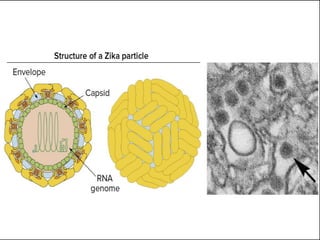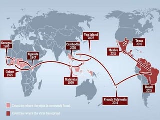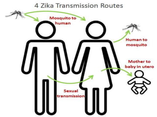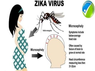 Zika virus is spread primarily via mosquito bites and can cause microcephaly and other brain defects if contracted during pregnancy. It is an RNA virus from the flavivirus family that causes mild symptoms like fever, rash and joint pain in most cases. Diagnosis involves testing for viral RNA early in infection or antibodies later. There is no vaccine or specific treatment, just managing symptoms. The virus was recently found to cause severe birth defects due to mutations that help it evade the immune system and inhibit interferon signaling compared to past strains.