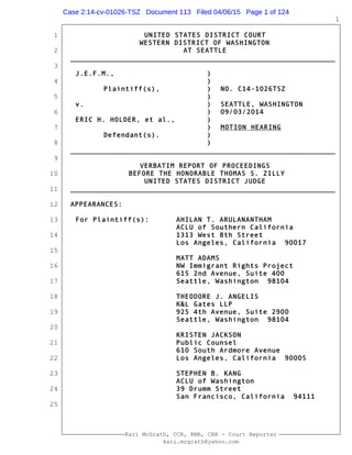 This document is the transcript from a motion hearing in United States District Court regarding a case involving the rights of juvenile aliens in deportation proceedings. The plaintiffs' attorneys argue that the court has jurisdiction to hear their claims for a preliminary injunction requiring the government to grant continuances to juveniles without lawyers. They state their claim is collateral to the underlying deportation proceedings. The judge questions whether the plaintiffs have alleged a valid basis for waiver of sovereign immunity in their complaint. The plaintiffs' attorneys respond that suing individual federal officers in their official capacity for injunctive relief on statutory and constitutional grounds waives immunity.