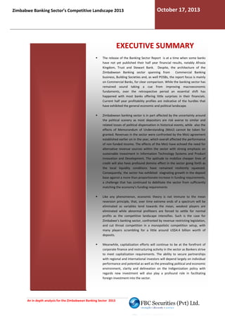 The document provides an overview and analysis of the competitive landscape of the Zimbabwean banking sector in 2013. It discusses the structure and performance of the banking sector, comparing it to other countries in the region. While the sector has remained sound, banks are facing challenges from the uncertain political environment and tight liquidity conditions. The ability to mobilize cheaper credit and diversify revenues will be important for banks going forward. The sector exhibits monopolistic and oligopolistic characteristics, with the potential for electronic banking to provide future opportunities.
