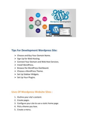 Zinavo is a key provider of WordPress development technology, offering services that simplify website management through WordPress, a versatile open-source CMS. The document outlines the process of building a WordPress website, including selecting a platform, domain registration, and customization steps. Additionally, it details the uses of WordPress, such as creating pages and configuring static homepages.