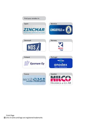 This document lists different types of zinc anodes available from Zinc-it along with their weights. There are over 30 listings for various anode types designated by codes like N1, N2, NH6, etc. ranging in weight from 1kg to 50kg. The anodes are available for purchase in several European countries and are used to prevent corrosion in marine applications.