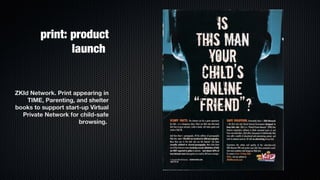 1) A print campaign by ZKId Network to support a child-safe virtual private network through publications like TIME, Parenting, and shelter books.