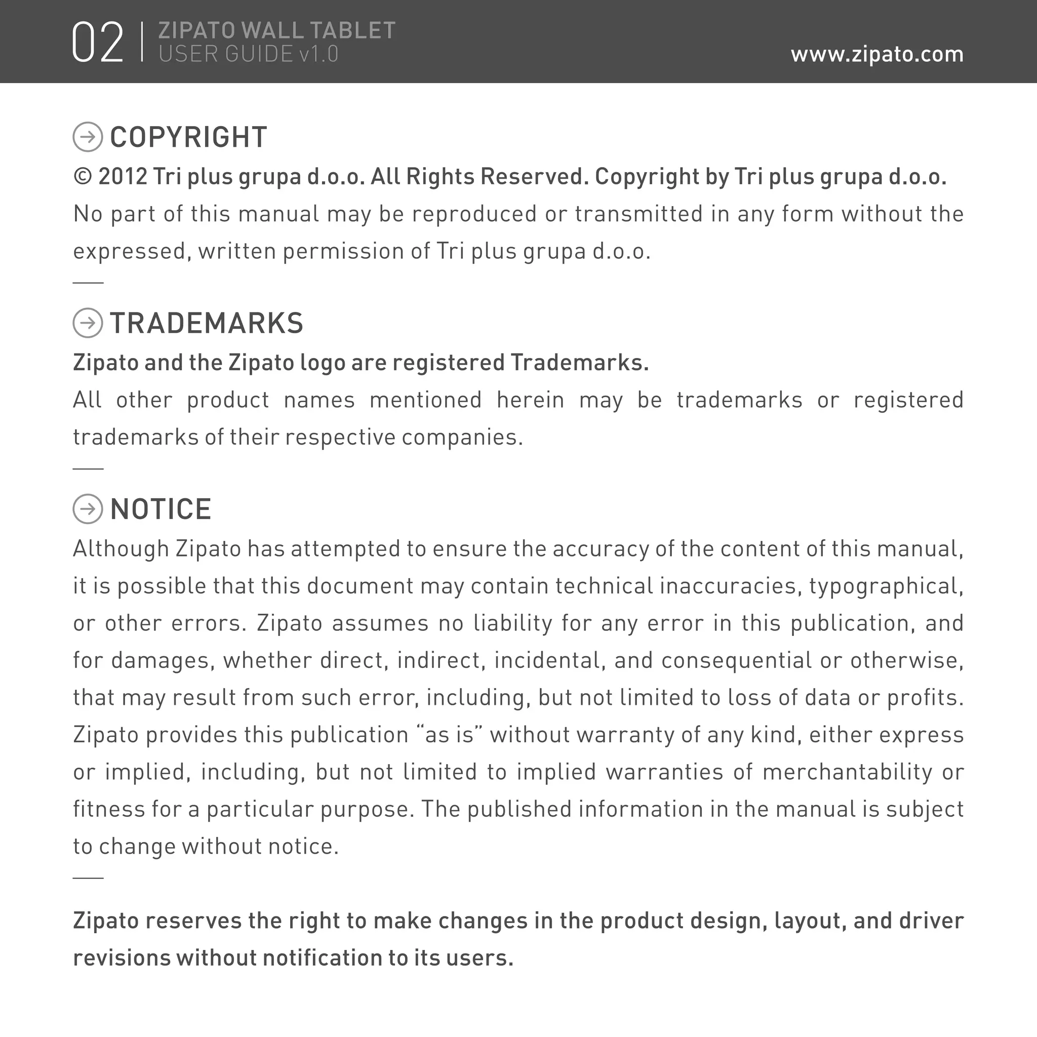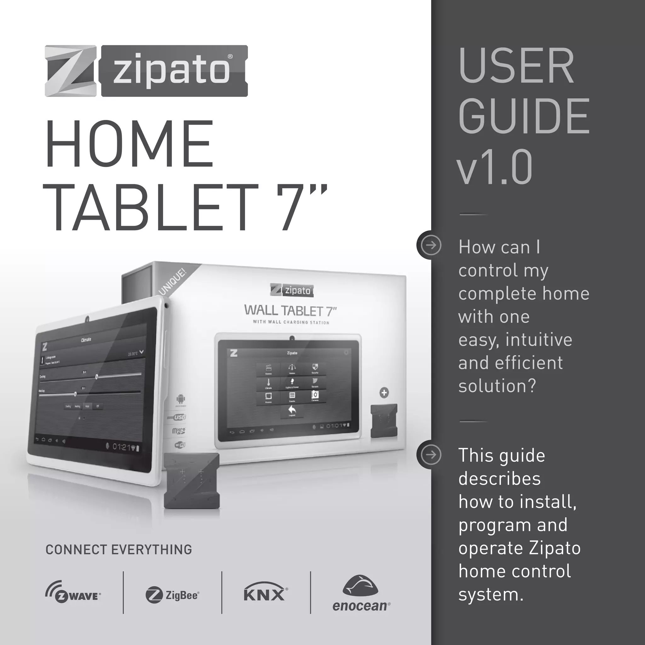 This document provides a user guide for the Zipato home control system tablet. It includes instructions on installing the tablet on the wall mount, creating an account, adding and removing connected devices from the system, and specifications for the tablet. The guide describes how the tablet allows users to control home security, lighting, climate, sun shading, irrigation, access, multimedia, video monitoring and energy metering from any smartphone. It also provides contact information for technical support.