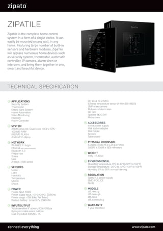 Zipatile is an all-in-one home control system that can replace multiple devices such as a security system, thermostat, elderly care system, home automation system, and intercom. It features a touch screen, sensors, video camera, speakers and microphones. The system is powered by an Android operating system and allows remote control through a smartphone app for security monitoring, video monitoring, thermostat control and more. Zipatile integrates a variety of protocols to connect devices from Philips Hue, Sonos, Nest and more for smart home control and automation.