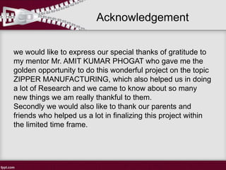 The document provides a comprehensive overview of zipper manufacturing, including its history, types, classification, and components involved in the manufacturing process. It highlights important patents related to zipper innovation and offers care tips for maintaining zippers. Additionally, the document includes acknowledgments to mentors and contributors involved in the research and project completion.