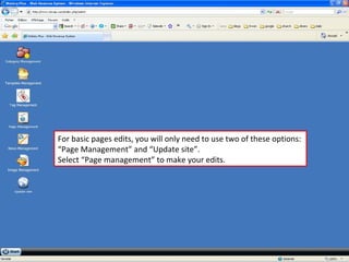 This document provides instructions for making basic page edits on an intelligent hotel website using the Page Management and Update Site options. The Page Management section houses the home page and other pages that can be previewed, edited, or have their metadata edited. Edits are made by clicking the edit icon and saved by confirming. Changes are published by selecting the updated page or all pages in the Update Site section and confirming.