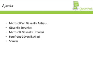 Forefront SunucuUygulamalarıForefront veAntigen Sunucu Uygulamaları Güvenlik Çözümleri, şirketlerin mesajlaşma ve iş birliği sunucularını virüs, worm , spam ve uygunsuz içeriklere karşı koruma altına alır.Birden fazla tarama motoru ile değişik katmanlarda maksimum koruma.Gelişmiş KorumaMicrosoft Exchange, Windows-tabanlı SMTP, SharePoint ve Office Communications Sunucuları ile entegrasyon ve yönetim kontolüEntegrasyon ve KontrolŞirketlerin uygunsuz iletişim ve tehlikeli e-mail eklerinden şirket içi ve dışında korunmasıGüvenli İçerik