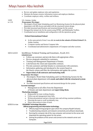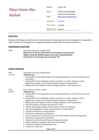 Mays Hasen Abu Keshek is seeking a challenging position leveraging her globally recognized qualifications and experience. She has a Bachelor's degree in Information Technology from Arab Open University and is proficient in programming languages like SQL, Oracle, C++ and VB. She has over 10 years of experience in roles like administrator, programmer, developer, account manager and director of women's sections. She is Cisco certified and trained in project management. She is skilled in Microsoft Office, networking and troubleshooting.