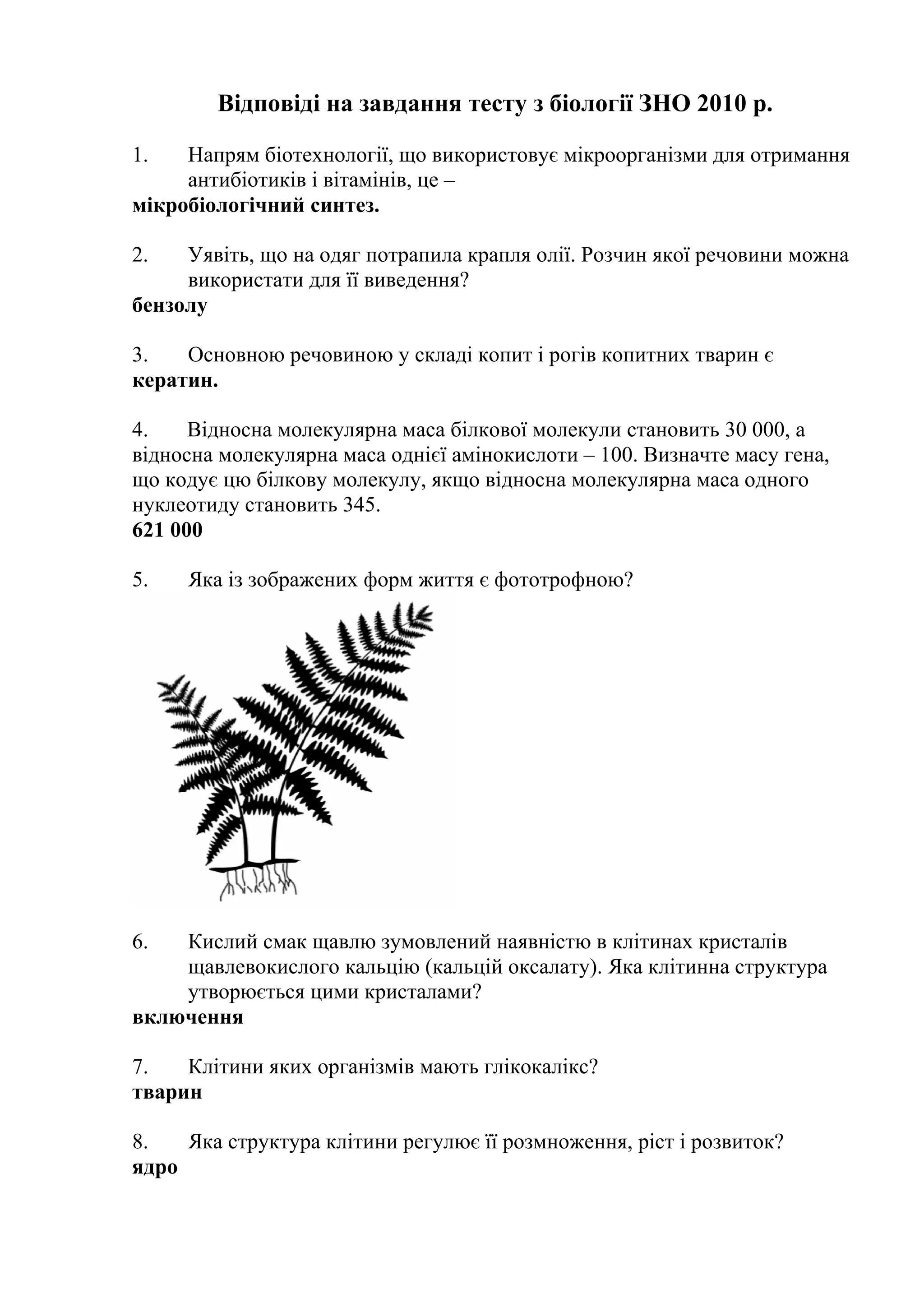 Відповіді на завданнятесту з біології ЗНО 2010 р.