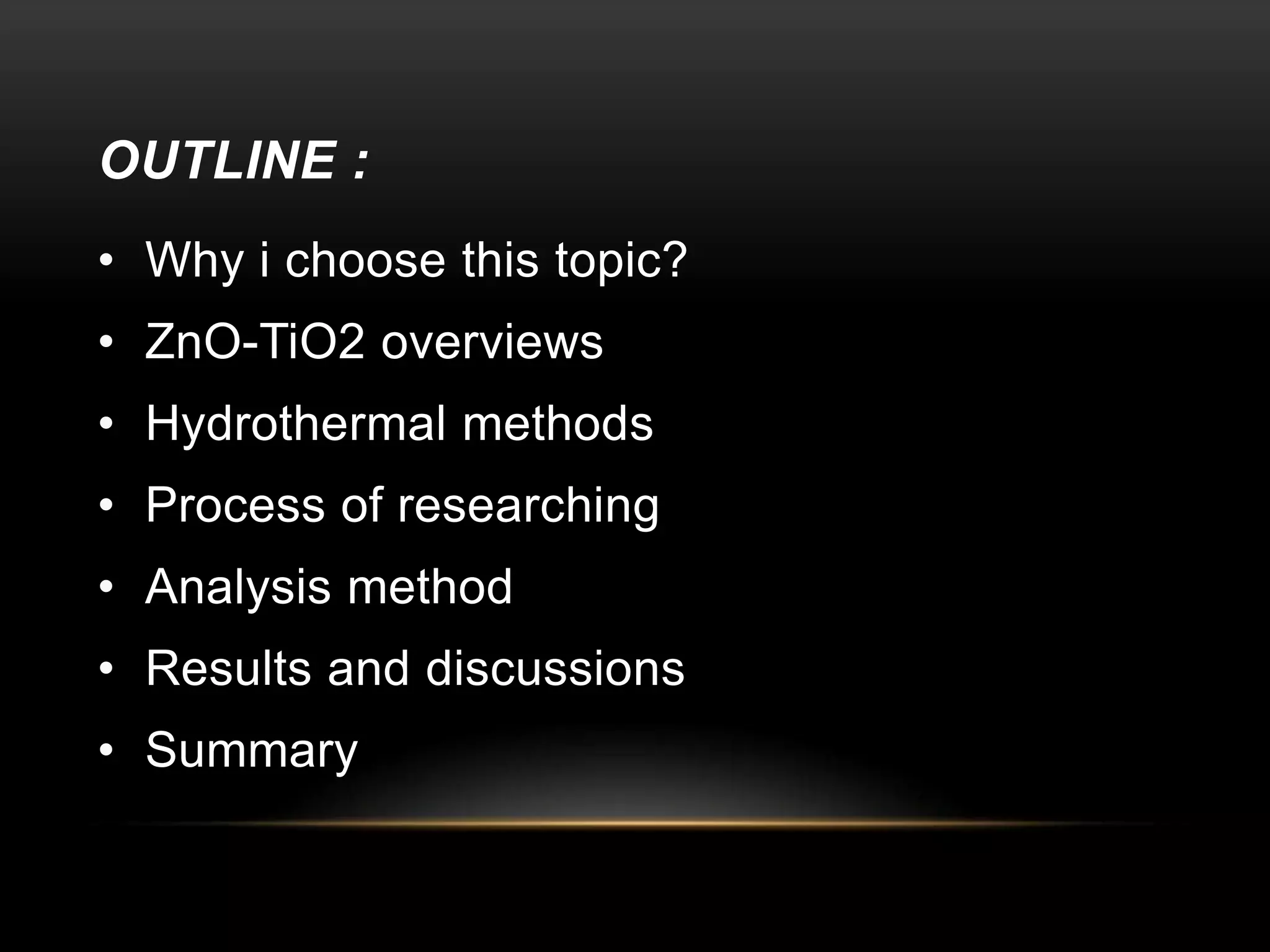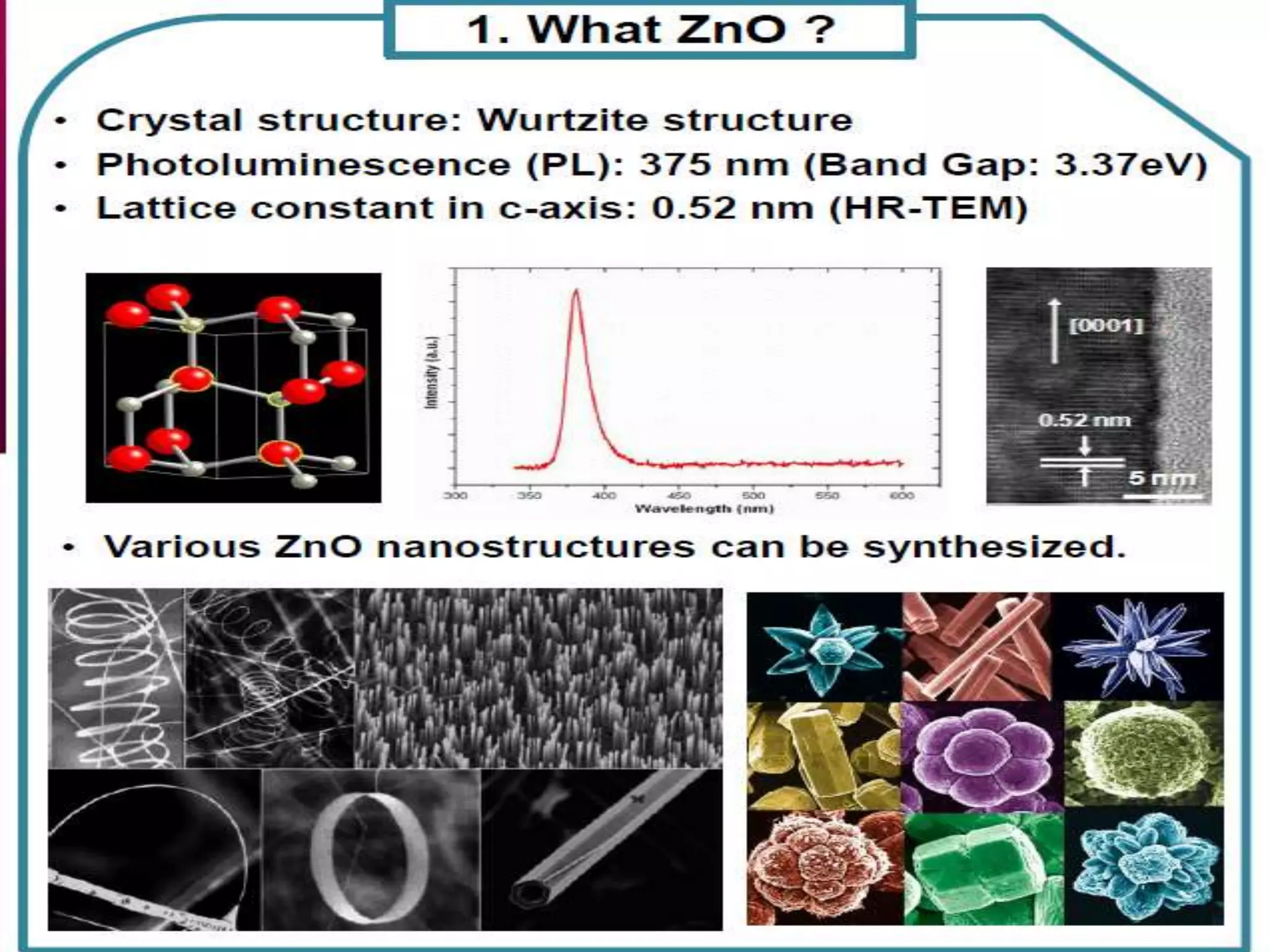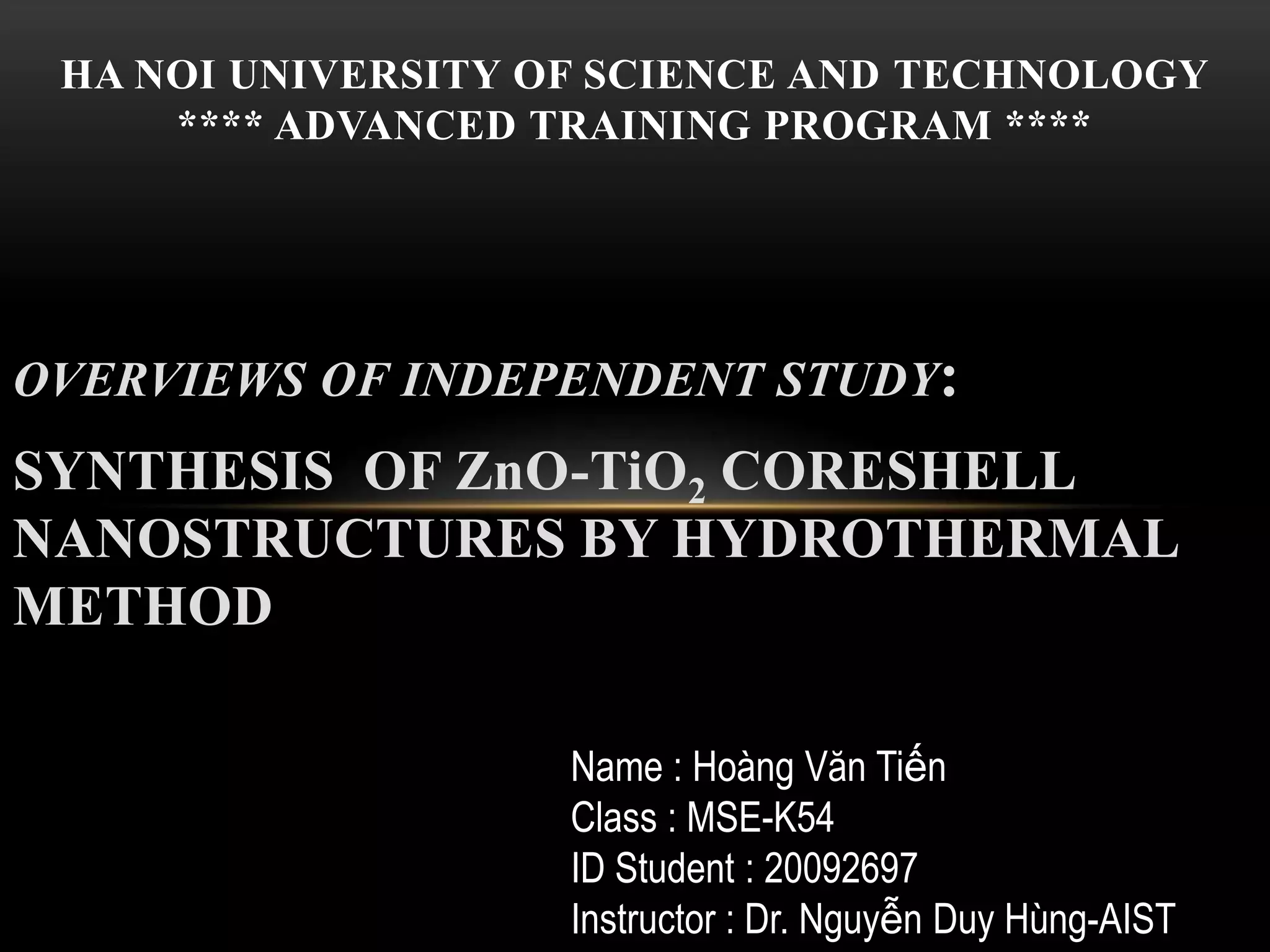 - Titanium dioxide shells were deposited on zinc oxide nanorods using a hydrothermal method. Zinc oxide nanorods were first grown on a fluorine-doped tin oxide substrate via hydrothermal synthesis using zinc nitrate hexahydrate, hexamethylenetetramine, and deionized water at 80°C for 1-3 hours. Titanium dioxide shells were then deposited on the zinc oxide nanorods by another hydrothermal treatment using titanium isopropoxide as a titanium precursor at 150°C for 5 hours. The zinc oxide-titanium dioxide core-shell nanostructures were characterized using X-ray diffraction, scanning electron microscopy, UV-visible spectroscopy, and solar cell testing to analyze their structure, morphology