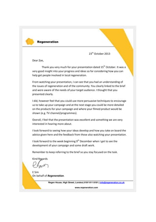 Zoe gave a presentation on local regeneration to Regeneration on October 15th. While E Sim thought Zoe demonstrated an understanding of regeneration issues and community needs, some suggestions were made to strengthen the campaign. These included using more persuasive techniques to encourage participation and providing more details on campaign products and broadcast locations. Overall, the presentation was excellent and E Sim looked forward to seeing how Zoe further develops her ideas by incorporating feedback and staying focused on the brief. An update would be provided the week of December 9th.