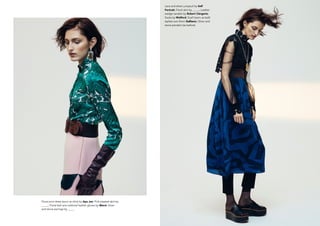 This document provides descriptions of outfits worn by models, listing the designers and brands of each clothing item and accessory. It describes shirts, tops, dresses, skirts, belts, shoes, and jewelry from designers including Steffan Schneider, Ashish, Apu Jan, Marni, Self Portrait, Robert Clergerie, and Beyond Retro.